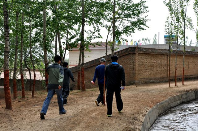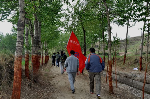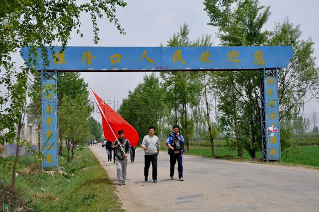 車輪滾滾,約兩小時(shí)的疾奔,四輛大巴載著我們歡愉的心,終于到了徒步的起點(diǎn)——攔隆口鄉(xiāng)上營(yíng)村。此地是一處鄉(xiāng)野田間,綠油油的麥苗翠綠翠綠,直挺挺的白楊一排一排,泥土的清新沁人心脾,田園如一幅油畫在視野中鋪展開來(lái)。