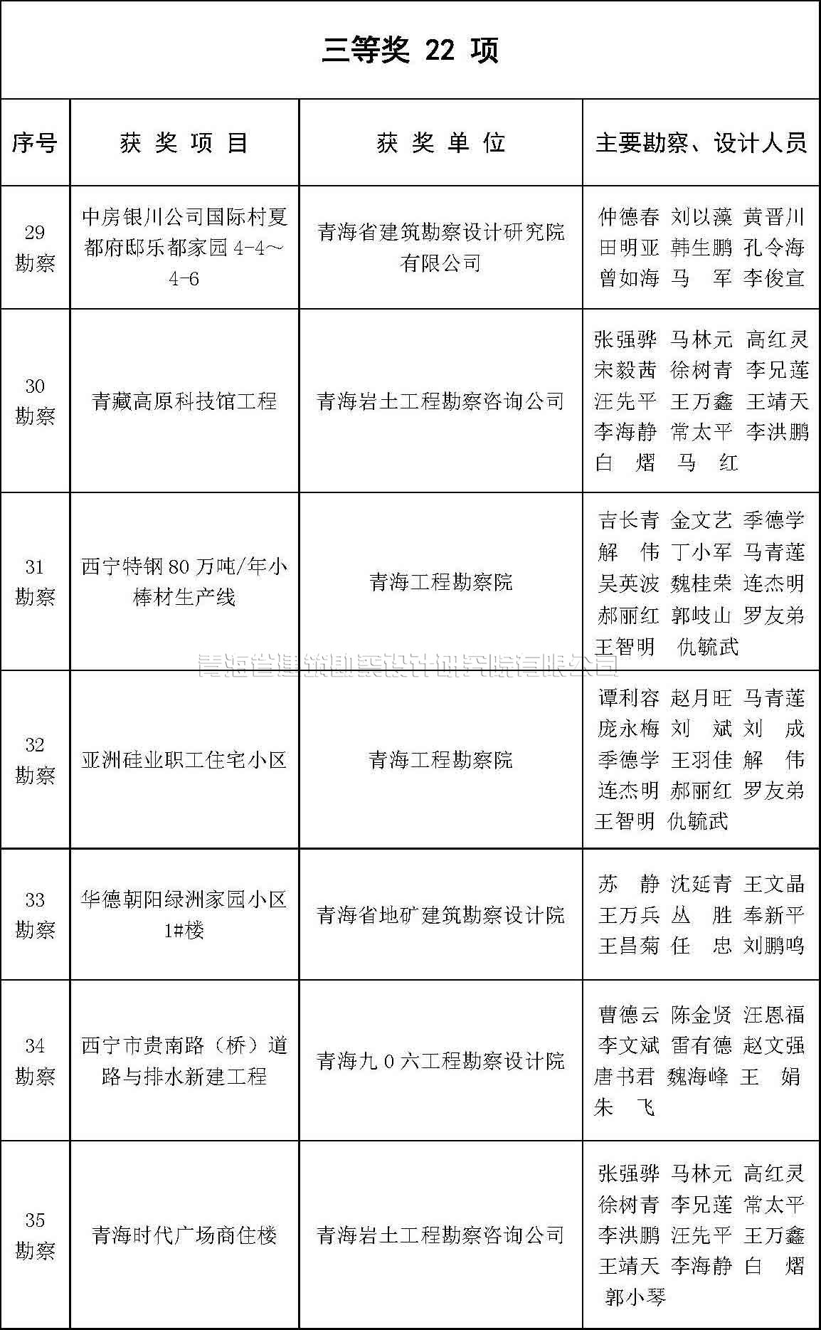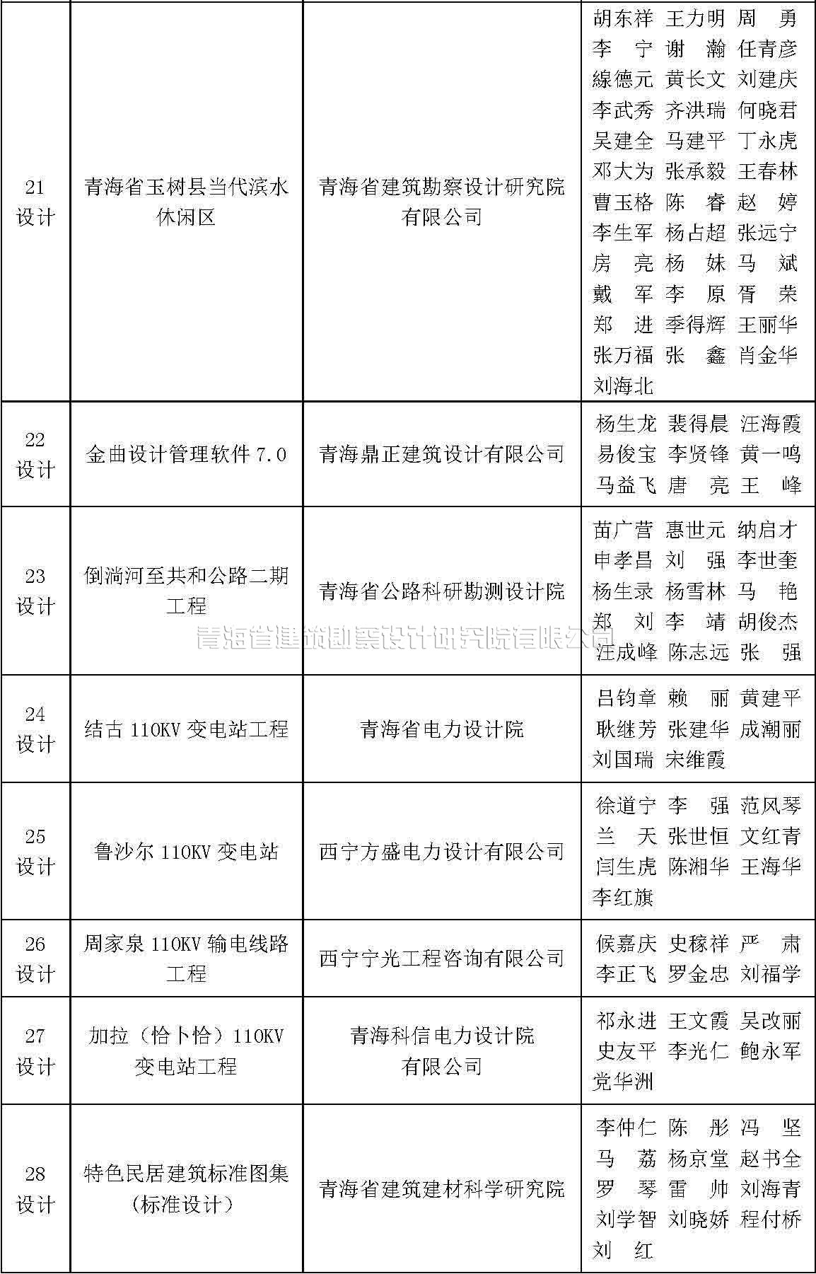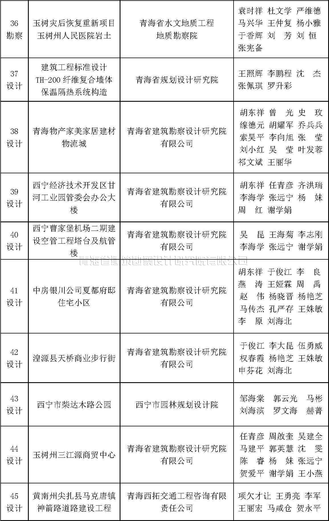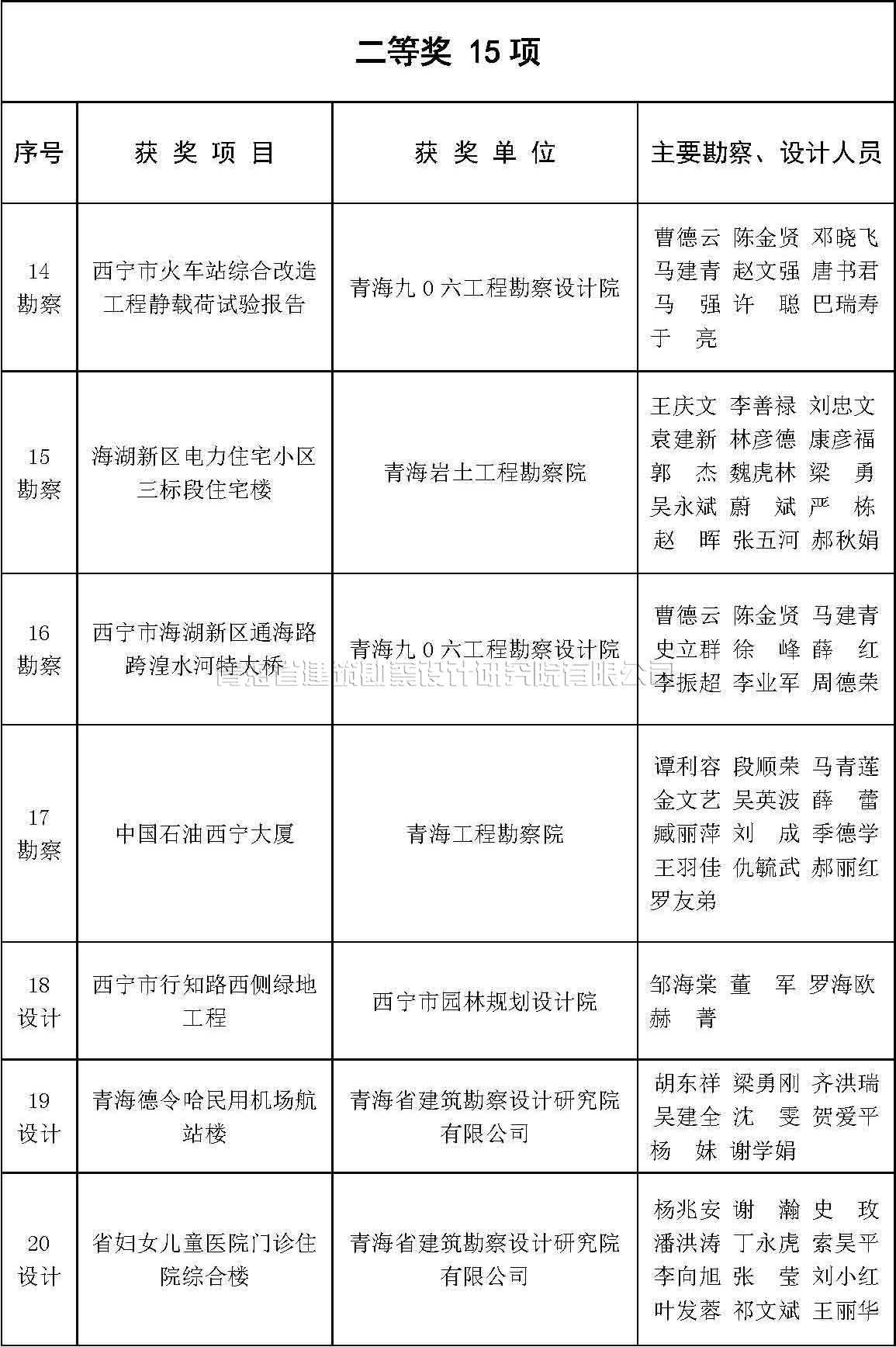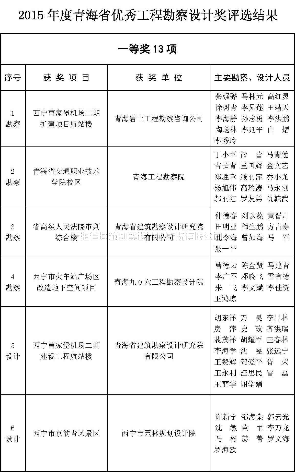 根據(jù)《青海省優(yōu)秀工程勘察設(shè)計獎評選辦法》(青建設(shè)[2011]534號,以下簡稱《評選辦法》)的規(guī)定,及中國勘察設(shè)計協(xié)會《關(guān)于評選2015年度全國優(yōu)秀工程勘察設(shè)計行業(yè)獎的通知》,我協(xié)會組織對2015年度青海省優(yōu)秀工程勘察設(shè)計獎進行了評選。評選結(jié)果于7月15日在協(xié)會QQ群中進行了公示,現(xiàn)予以公布。