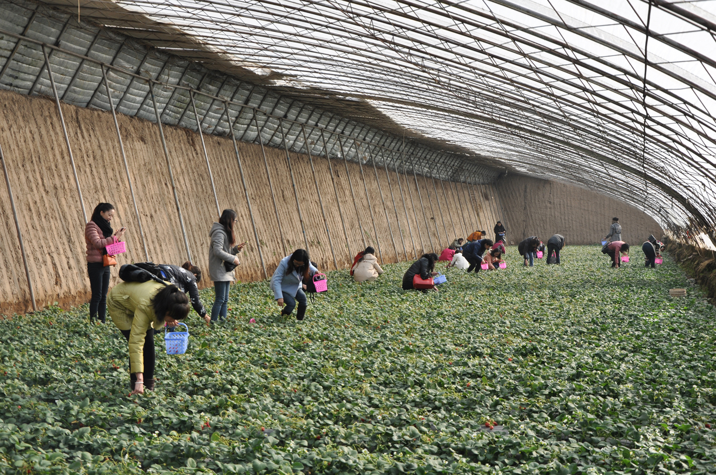 位于西寧市大堡子鄉(xiāng)陶北村的鄉(xiāng)趣園,占地面積500畝,園內(nèi)有120棟日光節(jié)能溫室,冬季栽種有草莓、菜瓜、辣子、蘑菇、青菜等新鮮果蔬。進(jìn)入大門,映入眼簾的是一派特色濃郁的鄉(xiāng)土文化和新穎別致的農(nóng)家小院。大家高高興興地集中在一起,黨辦主任兼女工主任宋景娥首先簡(jiǎn)要說了采摘活動(dòng)的主要程序,隨后,園內(nèi)工作人員帶著全體人員往采摘大棚走去。約一公里的鄉(xiāng)間小路,處處散發(fā)著鄉(xiāng)土的氣息,我們迎著羊年的嶄新朝陽,吮吸著少有的田間空氣,一會(huì)兒功夫,兩個(gè)外罩白塑料的溫室大棚赫然出現(xiàn)在眼前,這就是先要采摘的草莓大棚。每個(gè)人拎上分發(fā)的塑料筐,彎腰進(jìn)入溫棚內(nèi)。陽光透過塑料大棚,給本來就很潮熱的大棚如三亞之感,是呀!溫棚因這樣的溫度而造就,從室外到棚內(nèi),剛剛還是寒襲的冬季,一下子像是被空運(yùn)到海南島似的。那凸凹有致的綠色田梗,星星點(diǎn)點(diǎn)的紅紅草莓躲藏在綠葉之中,零零散散的小白花陪伴著成熟的紅。這詩意的紅、綠、白,醉染著我們的身心,迫不及待的心拉下了忍不住的手,大家一會(huì)彎著,一會(huì)蹲著,累了站一會(huì),馬上又繼續(xù)采摘……